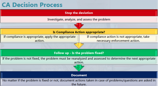 The use of Compliance Action should be considered the initial means of addressing all alleged, suspected, or identified instances of noncompliance with a rule or deviations from standards or procedures until a determination is made that Compliance Action is not appropriate.